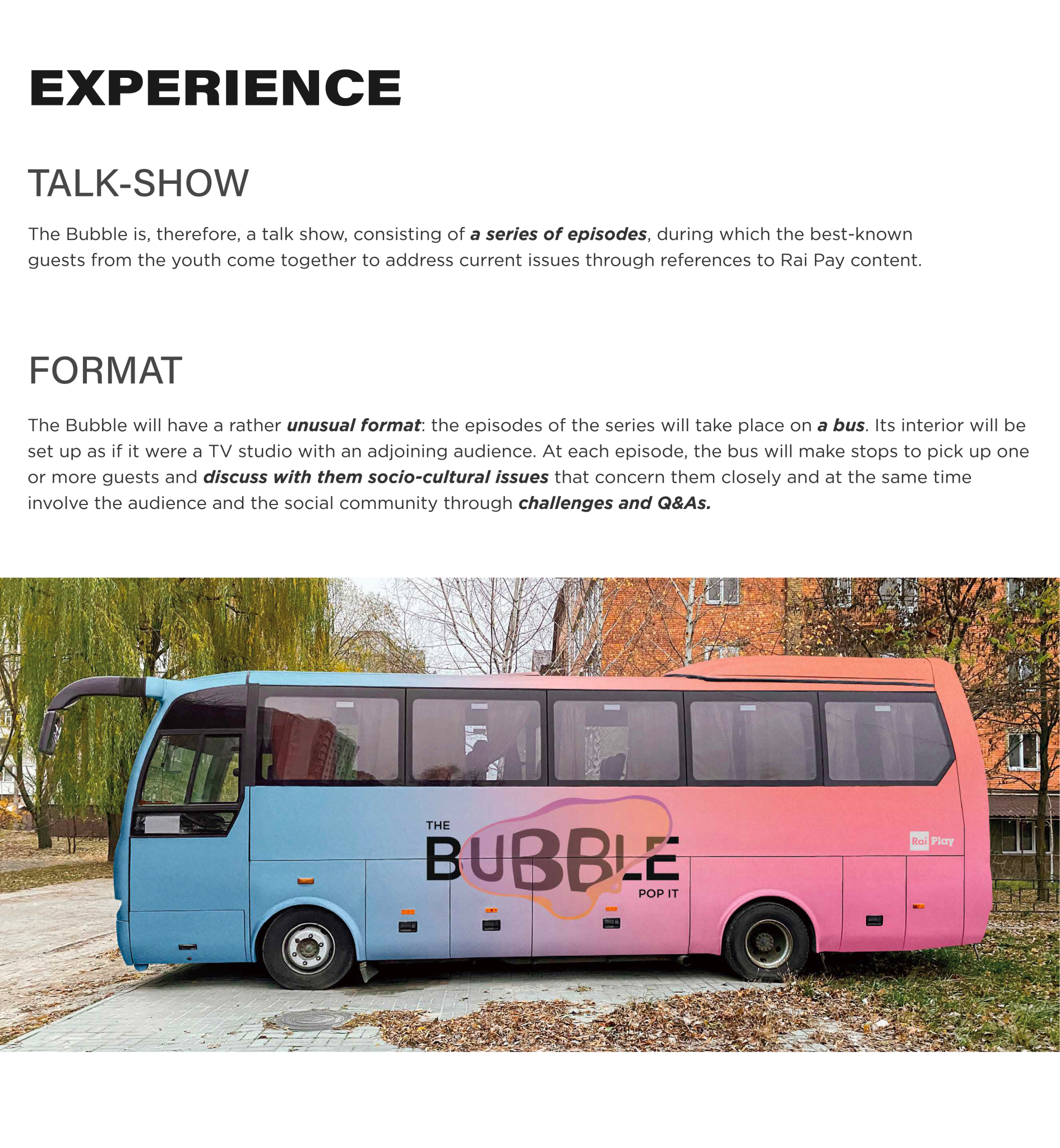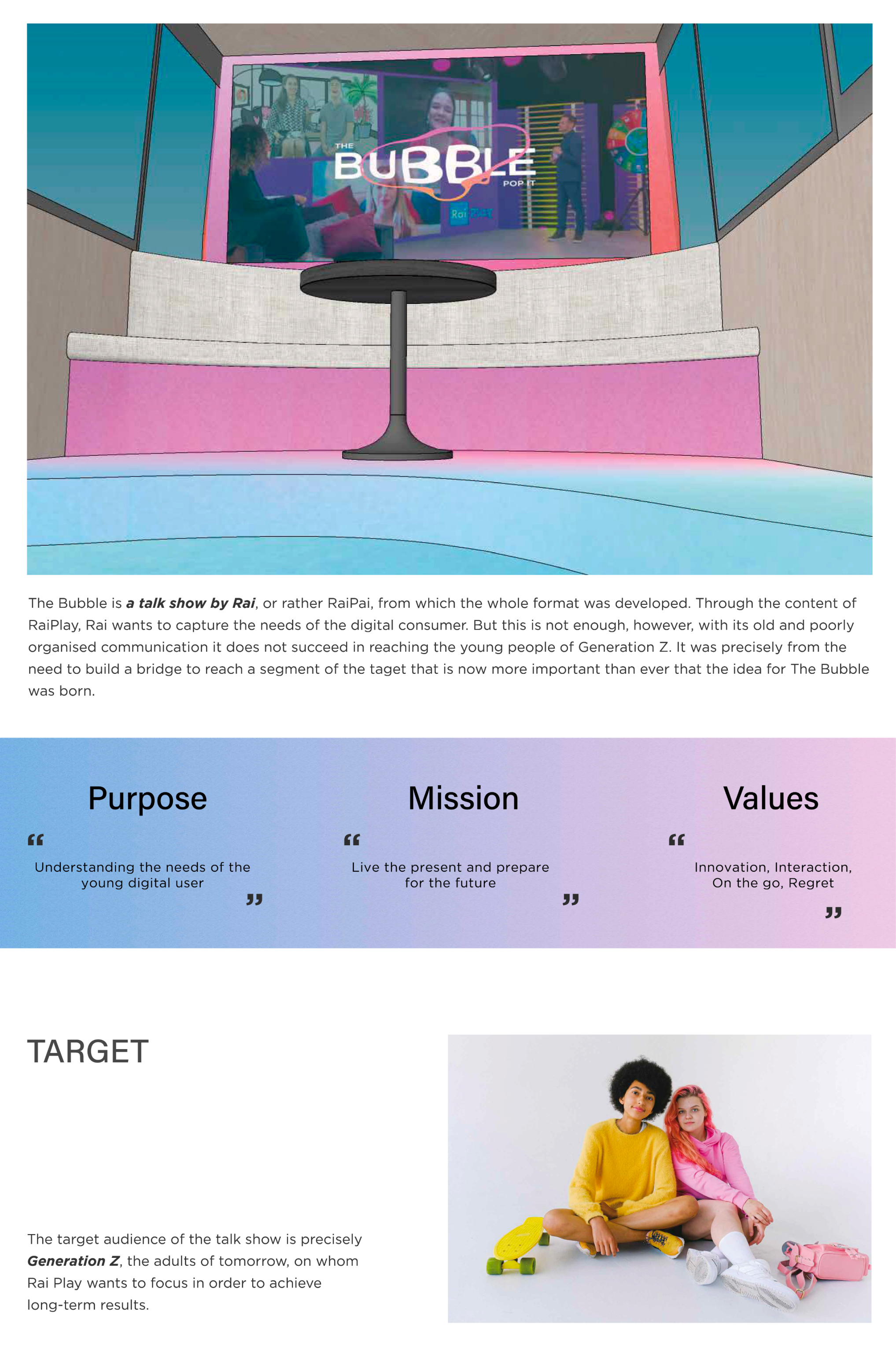 The Bubble is a talk show by Rai, or rather RaiPai, from which the whole format was developed. Through the content of RaiPlay, Rai wants to capture the needs of the digital consumer. But this is not enough, however, with its old and poorly organised communication it does not succeed in reaching the young people of Generation Z. It was precisely from the need to build a bridge to reach a segment of the taget that is now more important than ever that the idea for The Bubble was born.
